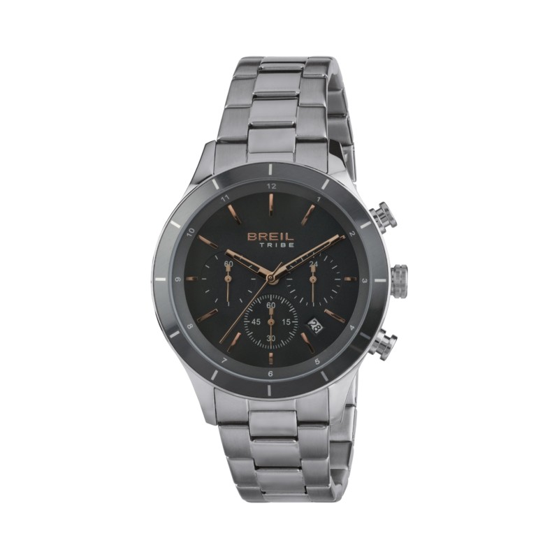 Cassa in acciaio inox dal diametro di 42 mm con ghiera in acciaio gun-metal. Quadrante analogico grigio scuro, indici a bastoni color oro rosa e datario tra le ore 4 e 5. Cinturino in acciaio anallergico; chiusura deployante con pulsanti. Resistente all'acqua fino a 50 metri di profondità.