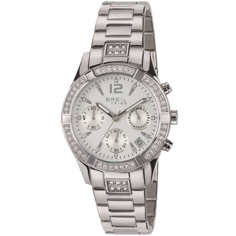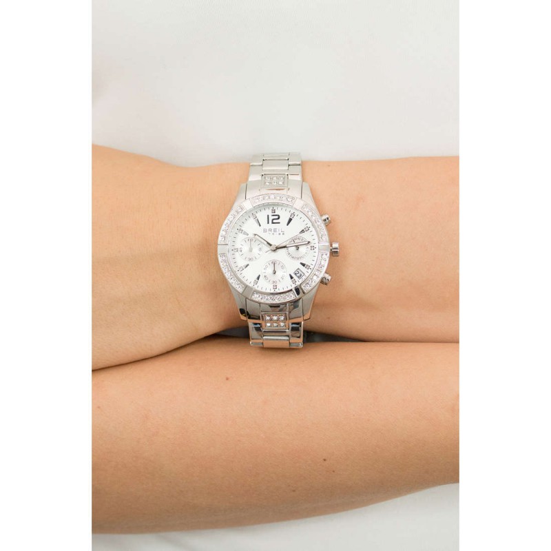 Cronografo femminile dal look glamour e seducente. Cristalli sfavillanti sulla lunetta e agli indici, quadrante bianco microbillet abbinato alla cassa in acciaio lucido, come il bracciale.