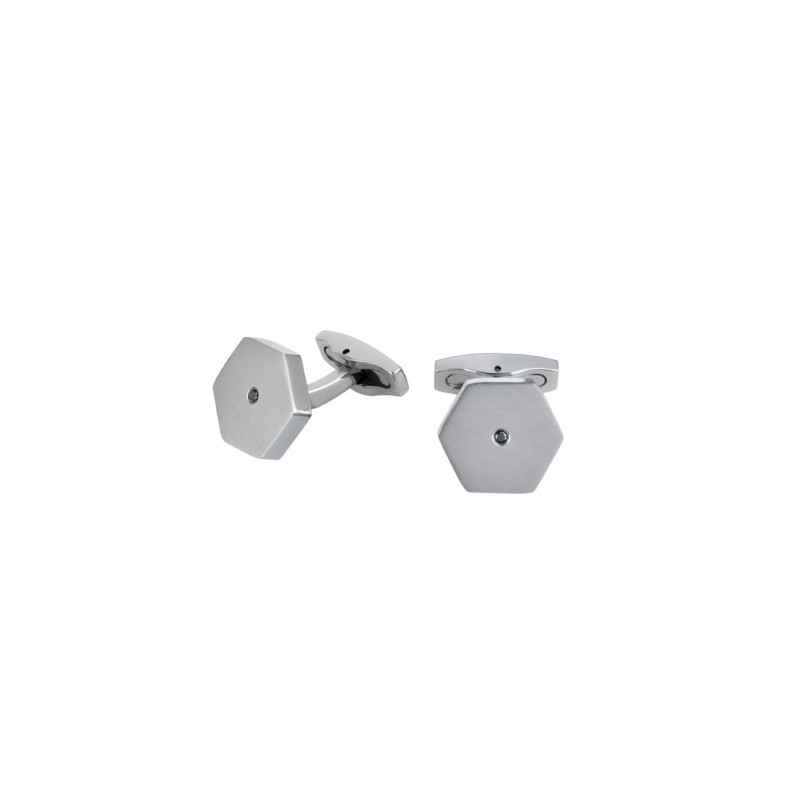 Gemelli da uomo in acciaio satinato con i bordi in acciaio lucido. Un piccolo diamante nero naturale al centro li rendono preziosi.