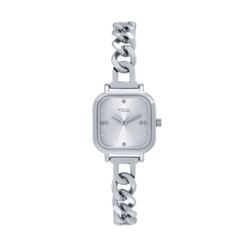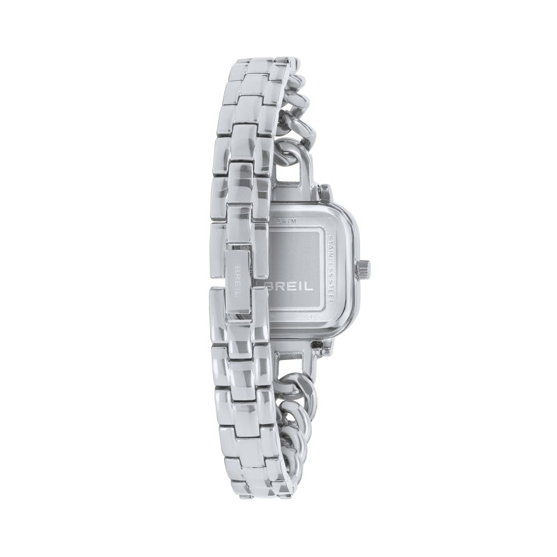 L’orologio solo tempo da donna Élise unisce raffinatezza e carattere in un design senza tempo. È definito da una cassa dalla forma squadrata in acciaio lucido e da un quadrante silver con effetto sunray, che cattura la luce. Gli indici, in UPMR silver e cristalli, aggiungono un tocco di brillantezza discreta ma sofisticata. A completare il look, il bracciale in acciaio con catena groumette.