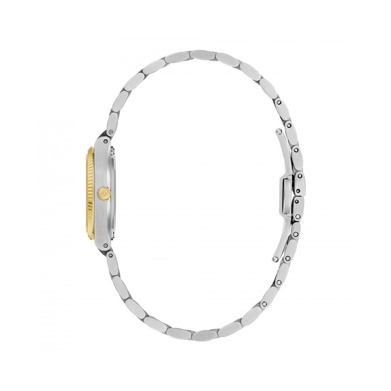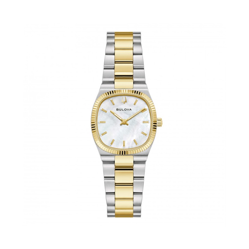 Questo orologio da donna Bulova apporta un nuovo stile alla già sofisticata collezione Sutton.Un'elegante cassa rettangolare in acciaio inossidabile bicolore è abbinata a un braccialetto coordinato.