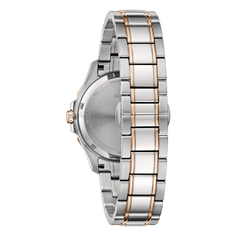 Il Bulova Marine Star 98P228 è dotato di una cassa in acciaio inossidabile color oro rosa e argento. Presenta un design moderno con un'audace lunetta fissa merlata e fianchi della cassa simmetrici. Un vetro zaffiro piatto e una corona protetta garantiscono un'affidabilità moderna, ulteriormente rafforzata da 100 m di resistenza all'acqua.