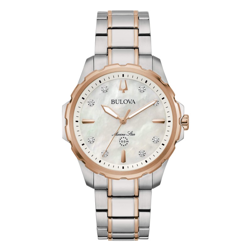 L'orologio Bulova da donna della collezione Marine Star caratterizzato, oltre all’impermeabilità a 10 bar, dall’eleganza di questa versione con quadrante madreperla