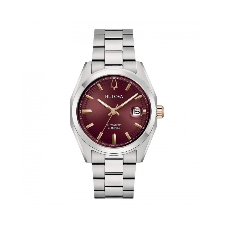 Cassa da 39 mm montante un vetro zaffiro che protegge il quadrante rosso con funzioni di ora e data. Bracciale in acciaio. Movimento automatico.