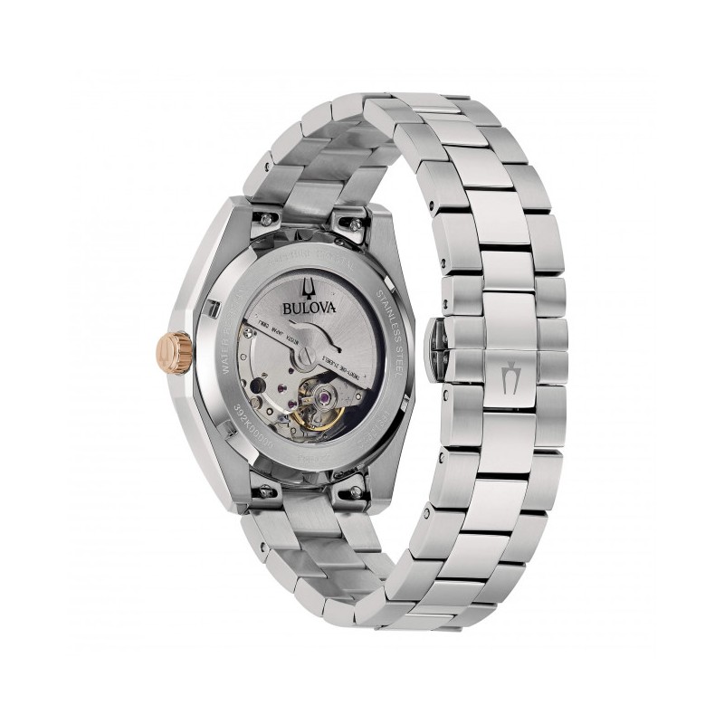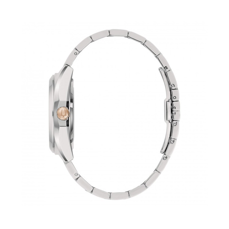 Questo orologio da donna Bulova apporta un nuovo stile alla già sofisticata collezione Sutton.Un'elegante cassa rettangolare in acciaio inossidabile bicolore è abbinata a un braccialetto coordinato.