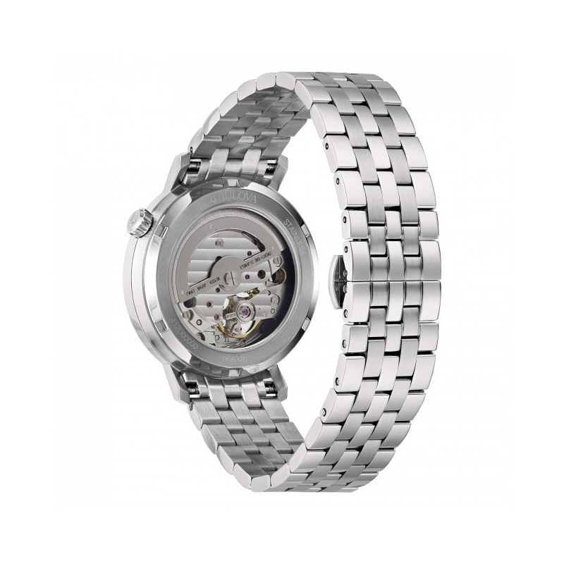 Orologio Bulova da uomo con cassa in acciaio inox da 38 mm e con corona in posizione a due ore, quadrante verde con apertura e lancette luminose e indicatori in argento, fondello aperto, movimento automatico con riserva di carica a 40 ore, vetro minerale, bracciale in acciaio e resistenza all'acqua a 30 metri.