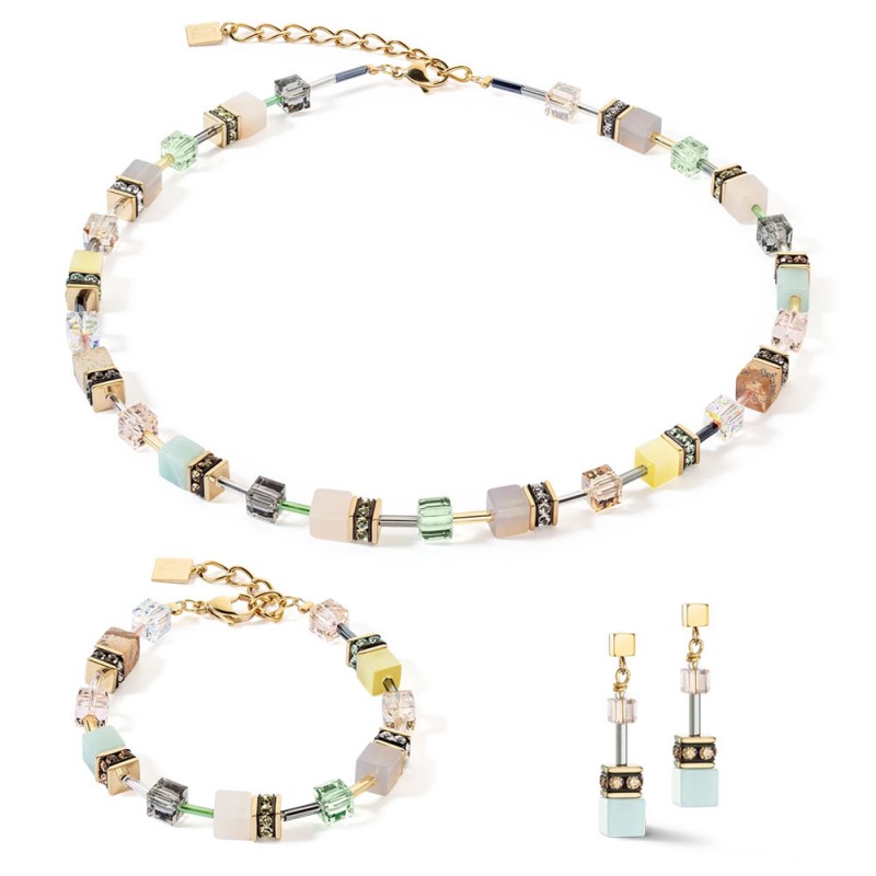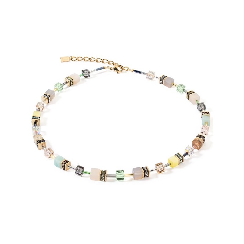 La collana GeoCUBE® Iconic Precious Golden Blush combina delicate tonalità blush e crema con caldi accenti dorati. Le iconiche sequenze GeoCUBE® in calcedonio, agata, avventurina rosa, cristallo di rocca e occhio di tigre sintetico sono arricchite da cristalli Swarovski® e strass scintillanti.