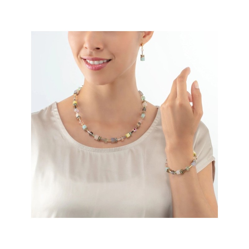 Le fresche tonalità aqua e blu chiaro donano leggerezza e luminosità a questa collana GeoCUBE® Iconic. I cubi iconici creano un elegante degradé ispirato al cielo e all’acqua. Ideale per look estivi o per aggiungere un tocco fresco a uno stile minimal.