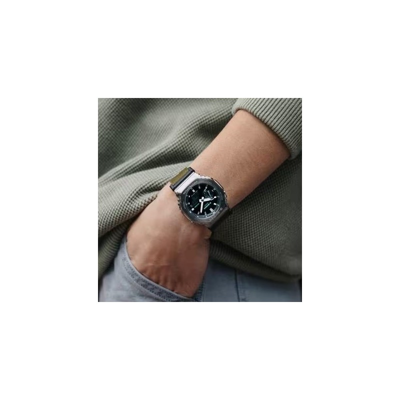 Nuovo GM-2110D, una combinazione analogico-digitale G-SHOCK basata sulla cassa GA-2100, ora con un'elegante cassa in metallo e un bracciale tutto nuovo. Forgiata e lucidata meticolosamente, la cassa ottagonale uniforme in acciaio inossidabile è parte fondamentale di un design semplice e senza fronzoli, con un look sofisticato e allo stesso tempo resistente.