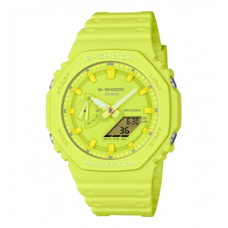 Orologio da donna Casio collezione G-Shock ref. GMA-S2100GA-3AER. Cassa verde petrolio in resina rinforzata con carbonio da 43 mm, display analogico digitale, lancette con rivestimento in Neobrite, cinturino verde petrolio in resina e chiusura con fibbia. Vetro minerale. Impermeabile fino a 20 bar.