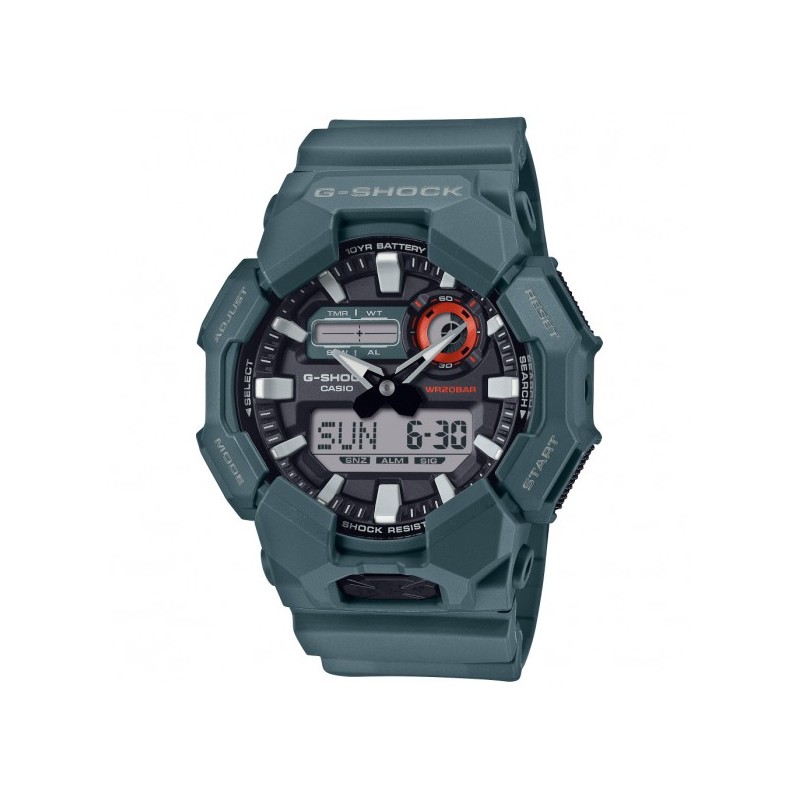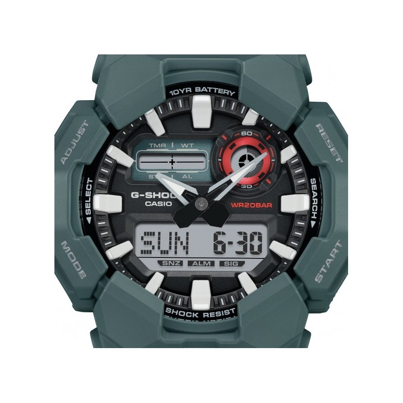 Il modello GA-010 analogico-digitale offre pratiche funzioni come l'ora internazionale e il cronometro, nonché una luce LED ad alta luminosità, facilmente accessibile dall'ampio pulsante sulla parte anteriore della cassa, che garantisce visibilità anche al buio.