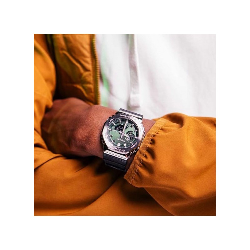 Nuovo GM-2110D, una combinazione analogico-digitale G-SHOCK basata sulla cassa GA-2100, ora con un'elegante cassa in metallo e un bracciale tutto nuovo. Forgiata e lucidata meticolosamente, la cassa ottagonale uniforme in acciaio inossidabile è parte fondamentale di un design semplice e senza fronzoli, con un look sofisticato e allo stesso tempo resistente.