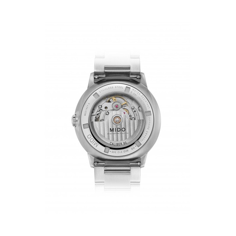 La collezione di orologi Commander 1959 viene prodotta senza interruzioni da quell'anno. Il bracciale integrato e il logo vintage di Mido sono tipici di questo modello iconico, così come la cassa monoscocca che racchiude un movimento automatico.