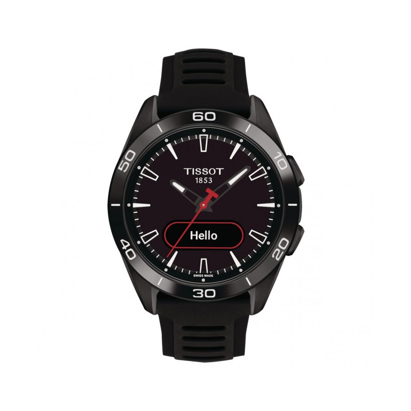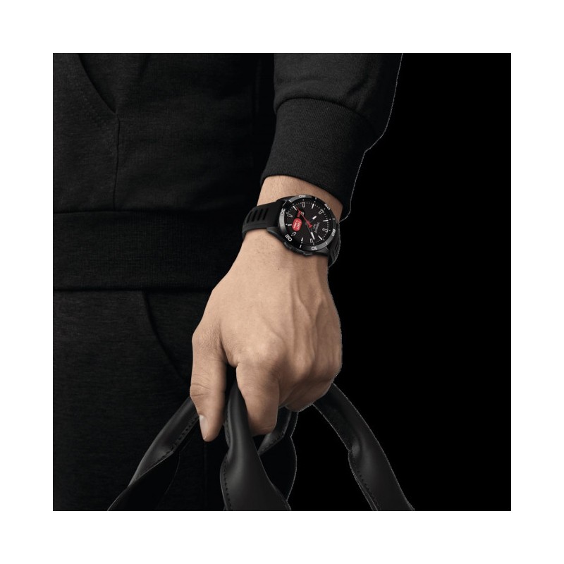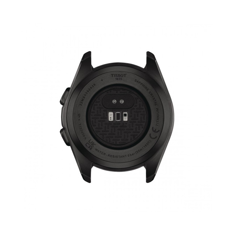Tissot T-Touch Connect Sport con movimento solare tattile al quarzo. Calendario perpetuo, allarme, tempo, fusi orari, ora legale automatica, timer, crono split, giro crono, diario di bordo del cronometro, contapassi, calorie bruciate, distanza percorsa, notifiche, allarme connessione, eco mode, automatic sleep mode, velocità, pace, battito cardiaco, dislivello, altitudine, chiamate in entrata, avviso di movimento. Cassa (43.75 mm) in titanio antimagnetico PDV nero con lunetta in ceramica e vetro tattile zaffiro antigraffio. Cinturino in silicone nero intercambiabile a sgancio rapido. Impermeabilità: 5 bar