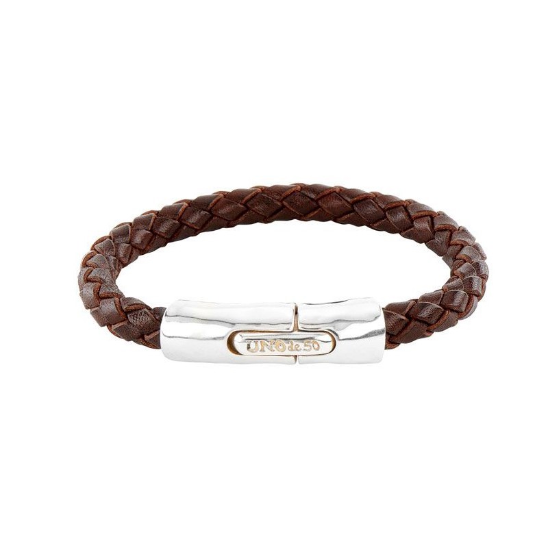 Bracciale unisex composto da un cordone intrecciato di cuoio marrone e chiusura a molla cilindrica di metallo bagnato nellargento. Laccessorio perfetto da indossare nel quotidiano e che non passa di moda. Un gioiello di UNOde50 che potrai condividere con la tua metvisto il suo design semplice. Disegnato da UNOde50 e prodotto in Spagna in maniera interamente artigianale.