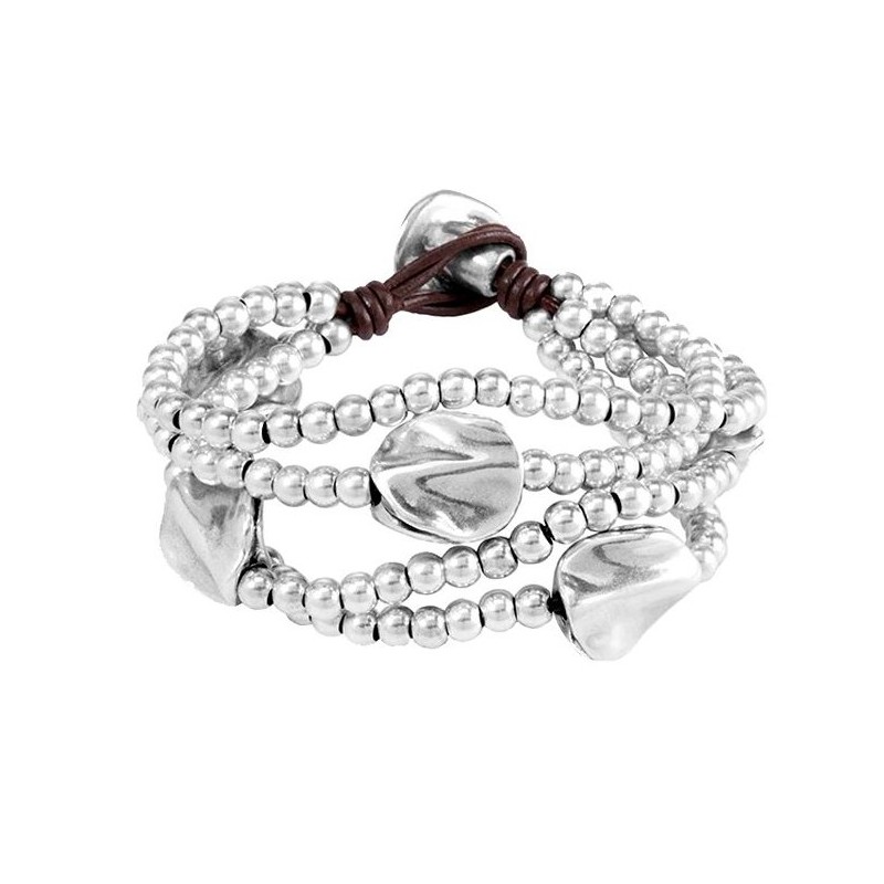 Bracciale da donna con pistrisce di cuoio, con perle e chiusura bagnate in argento. Presenta il logotipo di UNOde50 inciso sulla chiusura.