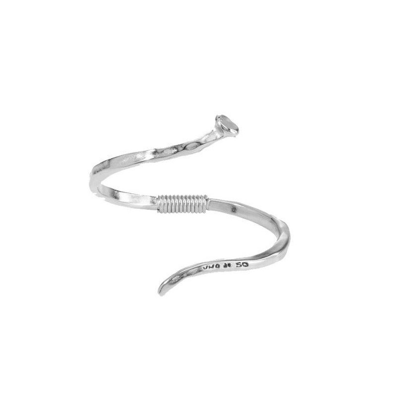 Bracciale iconico di UNOde50, rigido, di metallo bagnato in argento e con un originale design aperto a forma di chiodo modellato quasi a spirale, con una molla nella parte centrale che permette di aprirlo e chiuderlo.